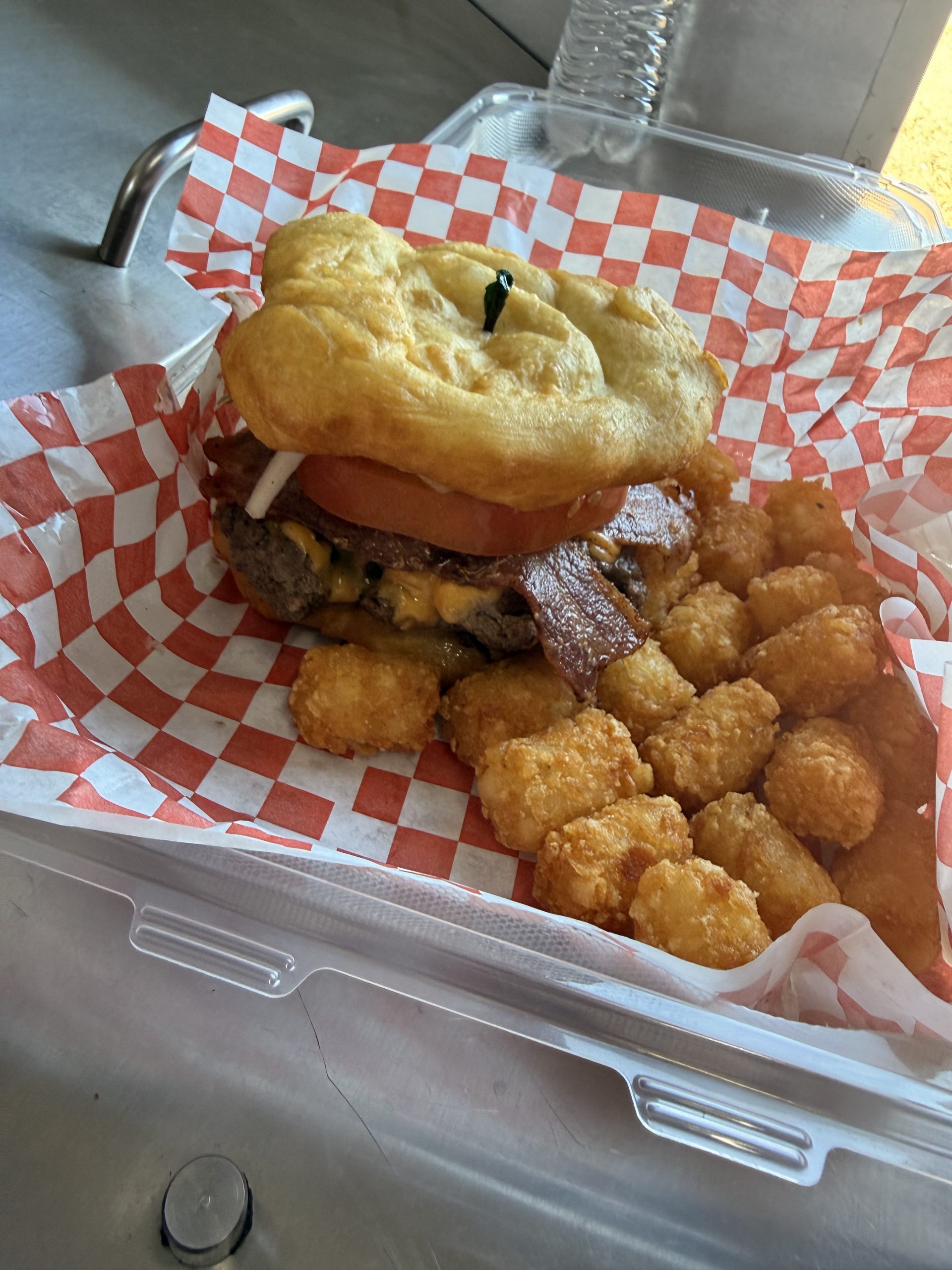 A golden, fluffy frybread stacked with juicy seasoned ground beef, dripping in smoky BBQ sauce and layered with crispy bacon for that perfect savory crunch. Melted cheese ties it all together, while fresh lettuce, ripe tomato, and crisp onion add that cool, classic burger bite. Every mouthful hits smoky, cheesy, and fresh all at once — served up hot with a side of golden, crispy tater tots.