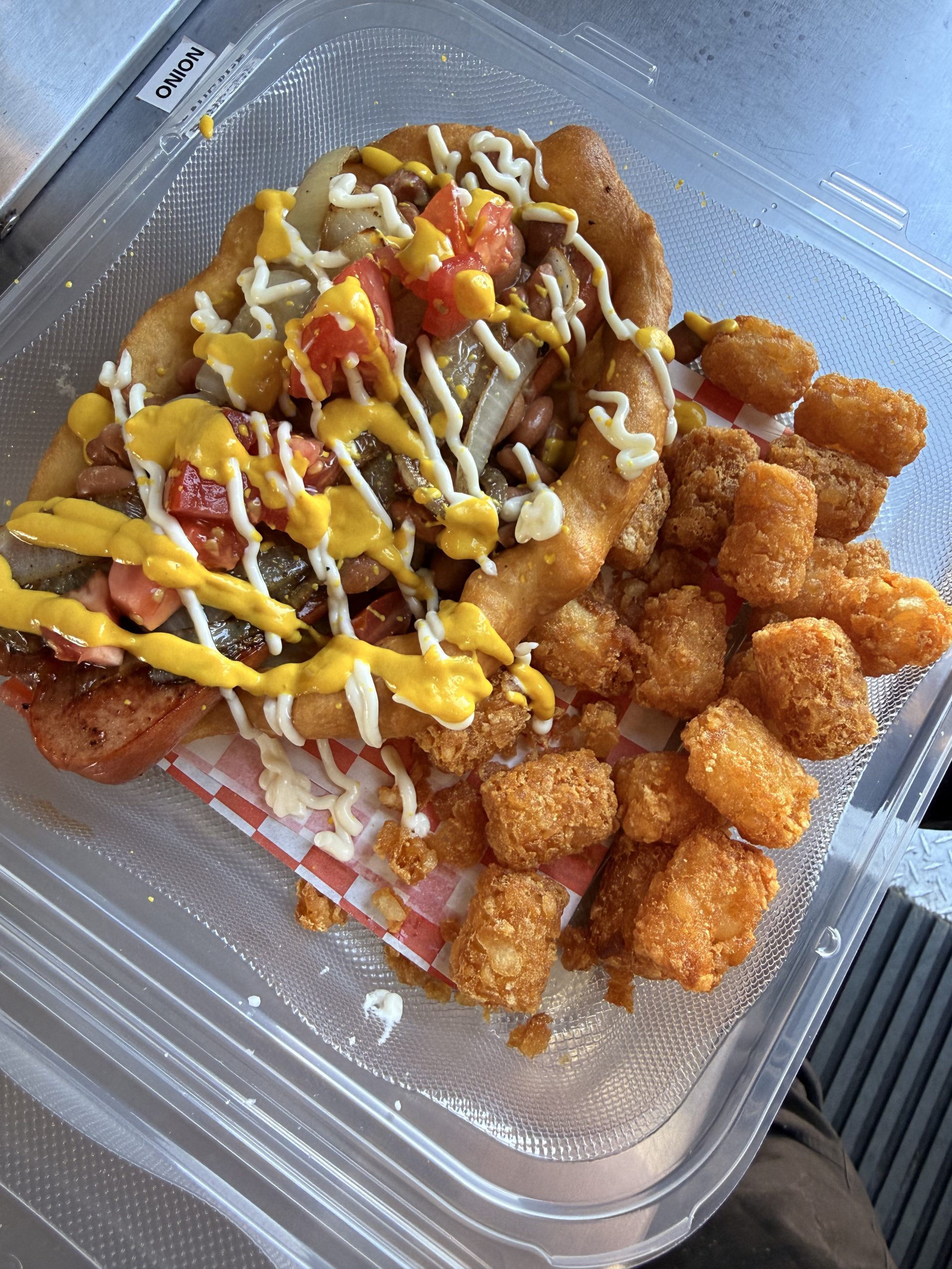 A golden, fluffy frybread topped with juicy slices of all-beef hot dog, seared for that perfect snap and smoky bite. Finished your way with classic fixings — ketchup, tangy mustard, sweet relish, and diced onions — all drizzled over a warm, pillowy base that soaks up every bit of flavor. Served hot with a side of golden, crispy tater tots for the ultimate frybread-meets-hot-dog experience.
